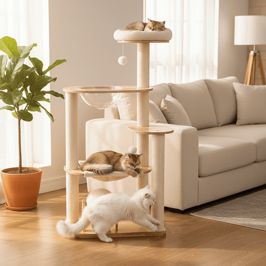 A modern cat tree features minimalist design, solid wood, and neutral tones—combining function and style for small spaces.